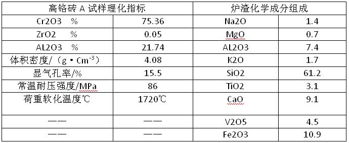 圖1(a)為表1中A試樣掛渣反應層的SEM照片,掛渣層內除了硅酸鹽低熔相外,還有清晰可見的針狀物,針狀物長約35μm,粗約1μm,能譜分析針狀物主要有Cr2O3和V2O5兩種成分組成,其中Cr2O3約占35%,V2O5約占60%;渣和耐火材料的界面呈鋸齒狀,部分Cr2O3顆粒倍熔蝕;反應層部分Cr2O3和氧化鋁被熔蝕,氣孔內充填有大量的玻璃相,結構比較疏松。