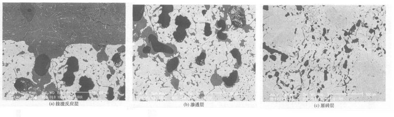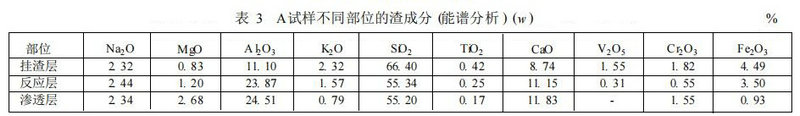 圖 1 ( b)為A試樣滲透層的SEM照片,滲透層內存在大量的玻璃相,結構比較疏松,主要由熔渣沿著磚中晶粒間的通道向磚內滲透和熔蝕造成。熔渣在滲透過程中與磚內的Cr2O3 和A l2O3接觸而造成其溶解,導致渣內Cr2O3和A l2O3含量隨著縱向深度的增加而呈遞增趨勢(見表3),從而熔蝕了耐火材料,破壞了基質同骨料間的結合,造成其結構疏松;并且距熱面不同的距離會有不同量和成分的渣在氣孔和晶界通道內停留形成不同的段帶,這些不同的段帶因熱膨脹系數的差異在溫度波動時產生熱應力導致磚的剝落而加速了其損壞。