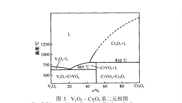 從A試樣掛渣反應層的XRD圖譜,可見在反應層除了主晶相Cr2O3,還存在少量的混合型尖晶石和釩酸鉻相,混合型尖晶石相(MgFeTi)O(ALCrFe)2O3主要由熔渣內的氧化鐵、氧化鎂和Cr2O3在距熱面較近的范圍內反應生成。能譜分析A試樣反應層Cr2O3顆粒的化學組成為:Cr2O3 84.94% , V2O5 11.77% , A l2O3 3. 29%可見,大部分V2O5固溶到Cr2O3 顆粒里,這一點從原渣、掛渣層、反應層和滲透層渣內V2O5含量隨著滲入深度的增加急劇下降 (表3)也可得以印證。圖3為V2O5-Cr2O3 共存時的相圖,V2O5的熔點僅670℃,與 Cr2O3共存時,最低共熔溫度665℃,也就是說,磚在使用過程中會不斷與石油焦分解產生的 V2O5接觸產生固溶,可在非常低的溫度下形成液相,從而導致Cr2O3 顆粒的熔蝕,形成鋸齒狀的界面和反應層的失強;熔蝕到渣內的Cr2O3在冷卻時又會同V2O5共同析晶生成釩酸鉻 (CrVO4 ),即圖1 ( a)中所見的針狀物 (能譜分析針狀物的組成與釩酸鉻的理論組成相似 )。值得注意的是 , Al2O3與V2O5共存時的最低共熔溫度僅640℃,與V2O5接觸時也會導致它的熔蝕。
