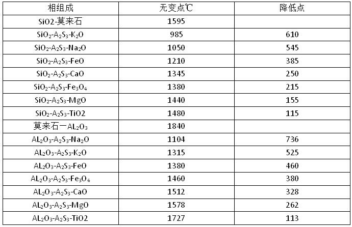 AL203-SiO2含量一定時,耐火澆注料性能的優劣主要取決于原料的純凈指標與外加劑的成份影響。澆注料雜質的存在,形成了AL203-SiO2雜質氧化物的三元相,其結果使硅酸鋁“耐材 ”的二元無變點溫度進一步降低。雜質對共熔點的影響見表1