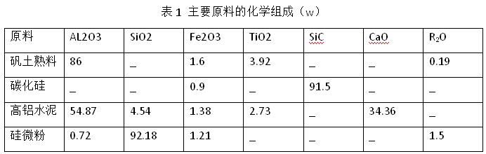 實驗所用原料為特級礬土熟料(體積密度3.15g·cm-3)、碳化硅、硅微粉、燒結劑、高強度高鋁水泥,化學組成見表1、