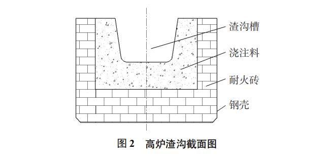 渣溝設計為長方體箱體結構箱體外殼鋼板厚度為30mm,箱體內鑲嵌耐火磚,最外層渣溝襯采用Al2O3-SiC-C耐火澆注料一次澆筑成型每條主渣溝長度為36m、公共渣溝長度為24m、小沖渣溝長度為18m,渣溝總長度為228m。渣溝澆筑后寬度為700mm、深度為 420mm坡度為