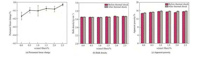 11200 熱處理后不同鋼纖維加入量對(duì)莫來石質(zhì)澆注料常規(guī)物理性能的影響。由圖1可見隨著鋼纖維加入量的增加,澆注料線收縮率逐漸變小(見圖 1a)。這是因?yàn)殇摾w維的熱膨脹系數(shù)較大約為(12~14)×10–6 /,遠(yuǎn)高于莫來石澆注料基體約為(4~6)×10–6 /,造成添加鋼纖維后的線變化率趨向于膨脹。同時(shí),隨著鋼纖維加入量的增加,成型時(shí)所需加水量增加雖然鋼纖維密度大于莫來石基體材料,但因鋼纖維加入量不大(最大量為2.5%),導(dǎo)致澆注料的體積密度隨鋼纖維添加變化較小,即體積密度在2.65~2.68 g/cm3顯氣孔率在14.6%~15.5%波動(dòng)變化。熱震后因材料內(nèi)部裂紋的出現(xiàn),結(jié)構(gòu)變得疏松,表現(xiàn)為澆注料的 體積密度下降(見圖 1b),顯氣孔率增加(見圖 1c)