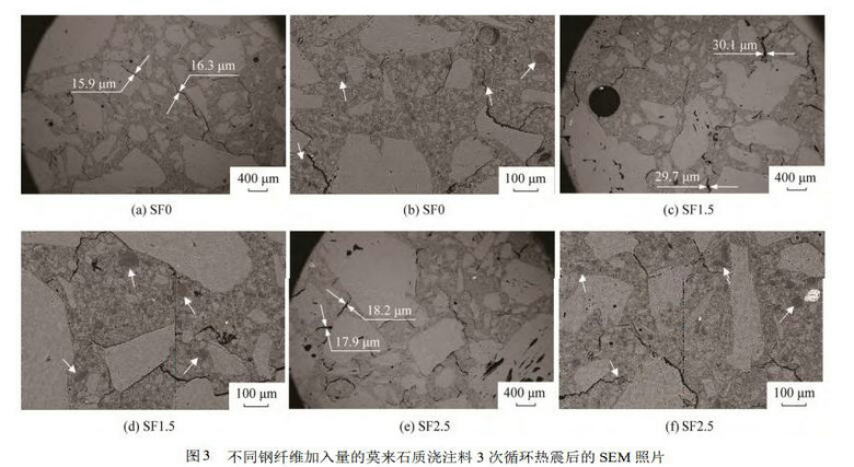 3為不同鋼纖維加入量莫來石澆注料熱震后SEM 照片。鋼纖維加入量為 01.5%2.5% (質(zhì)量分?jǐn)?shù))的澆注料樣品由于SEM分析樣品來自1 200 處理后的1100  3 次熱震循環(huán)后樣品,鋼纖維經(jīng)過4次熱處理后多數(shù)已熔化至基體材料中,甚至局部可能形成含Fe玻璃相,因此 SEM 觀察中并未看到殘留鋼纖維。由于熱處理溫度不高且保溫時(shí)間不長(1 200 保溫 3 h),局部還可看到未反應(yīng)的仍保持原來絮狀團(tuán)聚形貌的活性 ρ-Al2O3 (見圖3中箭頭所指的呈深灰色團(tuán)狀相)