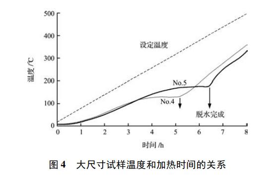 No5 試樣透氣率有所提高,為了比較,對 No4試樣進行了干燥試驗所獲得的試樣內部溫度曲線示于圖4。對應設定溫度,No4 試樣和 No5 試樣幾乎都是按照相同的速度持續升溫,但是 No4 試樣在 130 ℃附近升溫速度放緩,推測最大蒸汽壓力大約是03 MPaNo5試樣是在180 ℃放緩推測蒸汽壓力大約是 1.0 MPa。另外從拐點位置算起,No4 試樣的脫水完成時間比 No5 試樣快 1.3 h 左右。由圖可知,No4 試樣尺寸大、透氣率高、內部 蒸汽壓力沒有提高,干燥結束時間也早。