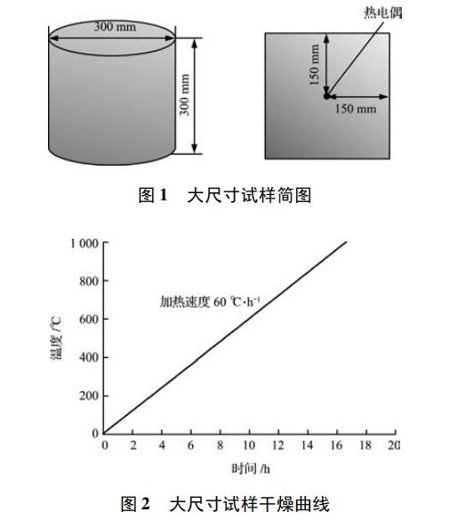 試樣的簡圖示于圖 1 1 所示試樣的尺寸是Φ300 mm × 300 mm熱電偶置于150 mm × 150 mm中心位置,混煉好的澆注料進行澆注,養生24 h。如圖2所示,脫模后以60 ℃ / h的速度加熱1000 ℃。根據所獲得的試樣內部溫度曲線對干燥特性進行了評價。