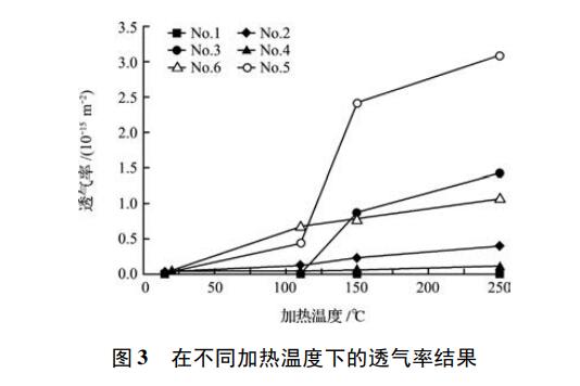 為了驗證特殊添加材料和有機纖維對提高透氣性的效果,按1列出的配料制備了鋁硅質低水泥澆注料( 63% Al2O333% SiO2 ) 進行了評價。澆注到Φ50 mm × 30 mm 的圓形模具中,于 15 ℃ 下養生24 h,脫模。然后在 110 ℃ × 24 h150 ℃ × 24 h250 ℃ × 24 h 的條件下加熱。根據使用透氣率測定裝置測定了加熱試樣的透氣率。