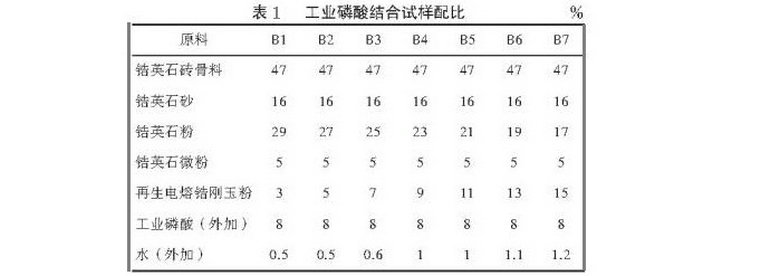試驗采用的主要原料有:鋯英石磚骨料(0~3mm)、鋯英石砂(80~150目)、鋯英石粉(≤0.045mm)、鋯英石微粉(≤0.002mm)、再生電熔鋯剛玉粉(≤0.045mm)、工業磷酸(85%)。其配比方法見下表1;