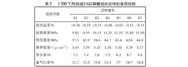 從表中可以看出磷酸結合試樣B1~B7的硬化時間在32~34h。在經過1200℃熱處理后3h后的試樣各項指標列于表3,從表3中可以看出,隨著再生鋯剛玉粉占比的增加,試樣的耐壓強度并無規律性的變化,抗折強度又波動增大的趨勢;線變化率隨著再生鋯剛玉粉的增加,收縮增大;體積密度隨著再生鋯剛玉粉的增加而減小,吸水率、顯氣孔率隨著再生鋯剛玉粉的增大而增大。
