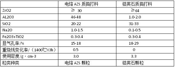 鋯質骨料是鋯質搗打料的骨架,對鋯質搗打料的高溫物理性能起重要作用。目前常使用的玻璃窯爐池底鋯質搗打料主要有兩種:一種是電熔AZS質搗打料,一種是鋯英石質搗打料。其理化指標如下表。