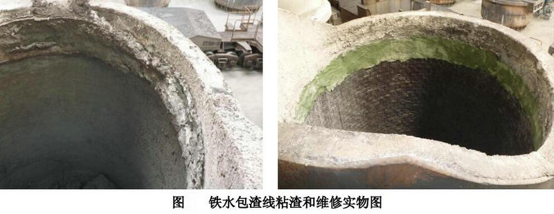 下圖示出了鐵水包渣線磚粘渣和清渣后維護情況。鐵水包渣線存在粘渣現象,嚴重時影響